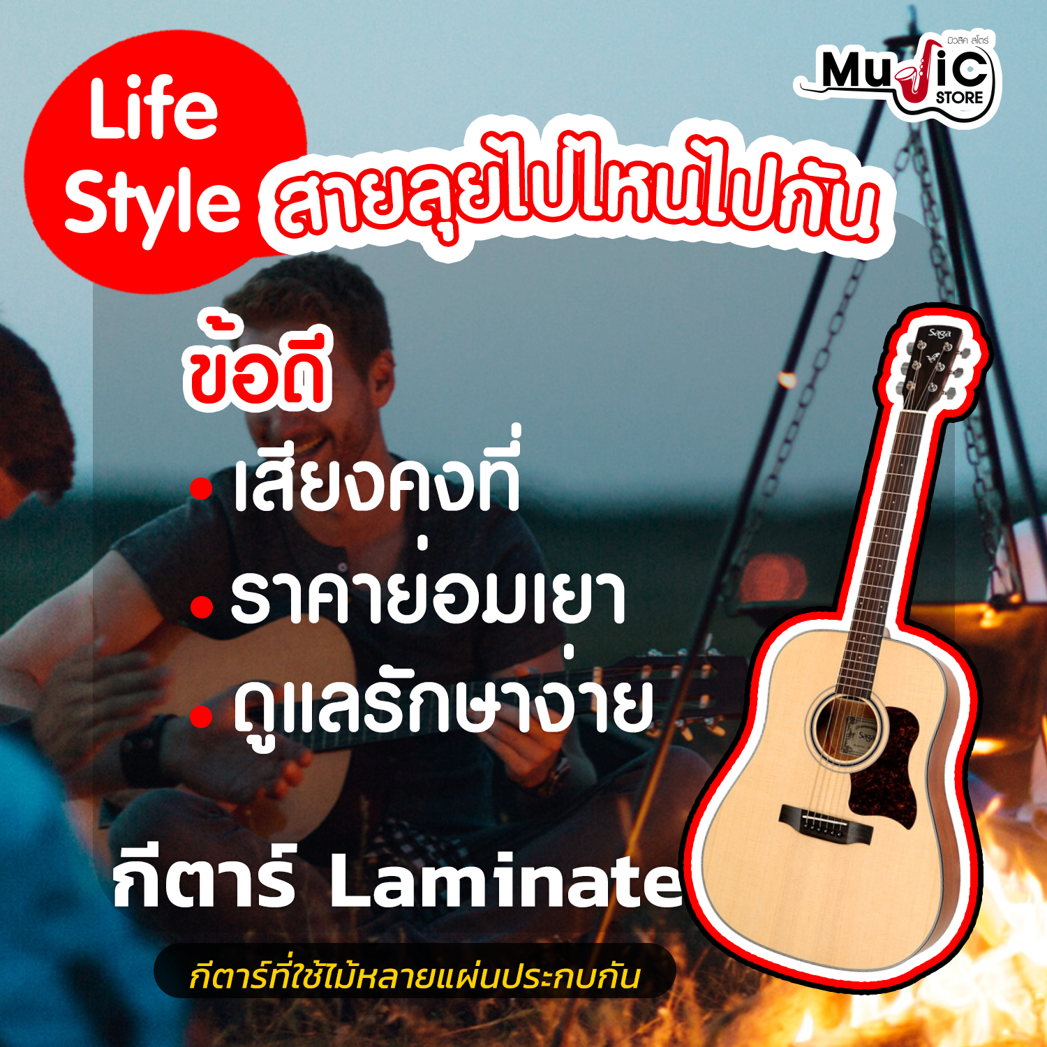 ข้อดี : ไม้laminateดูแลรักษาง่าย ไม่ต้องดูแลเท่ากับตัวหน้าไม้แท้ เหมาะกับทุกสถานที่ เหมาะกับไลฟ์สไตล์สายเที่ยว หรือสายแคมป์ปิ้ง เพราะมีความทนทานสูงเนื่องจากเป็นการนำไม้มาซ้อนกัน 2-3 แผ่นครับ และเหมาะสำหรับมือใหม่ที่อยากได้กีตาร์ราคาสบายกระเป๋าสักตัวเพื่อมาฝึก เสียงค่อนข้างคงที่ เสียงไม่เหวี่ยงครับ