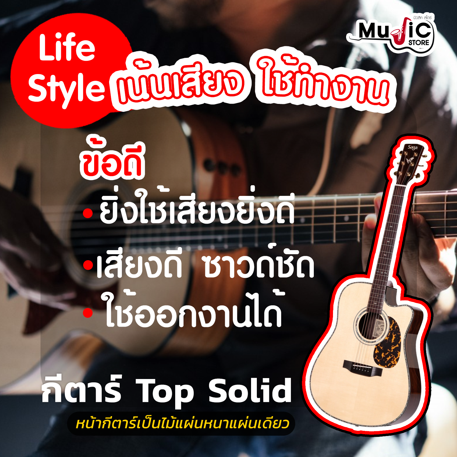 ข้อดี : กีตาร์ Top solid ถือเป็นทางเลือกที่ดีสำหรับคนที่อยากได้กีตาร์เสียงดี ๆ สักตัว มาใช้ในการทำงาน ไม่ว่าจะนำมาใช้อัดเพลง หรือนำไปออกงานต่าง เหมาะกับไลฟ์สไตล์ของคนที่ต้องการกีตาร์ที่เสียงมีคุณภาพ ในราคาที่จับต้องได้ และข้อดีอีกอย่างหนึ่งของตัว Top solid คือจะให้โทนเสียงที่กังวาล จะได้ยินเสียงตัวเนื้อไม้ และตัวโน๊ตจะชัดกว่าตัวลามิเนต ยิ่งใช้เสียงจะยิ่งดีขึ้นครับ