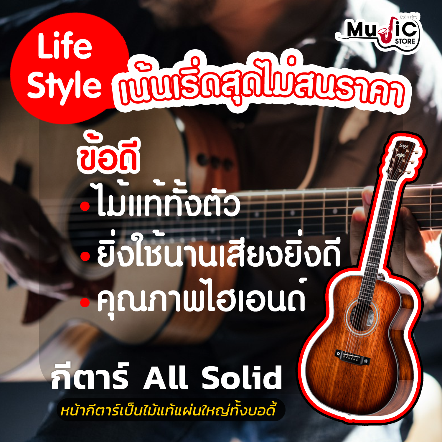 ข้อดี : สำหรับคนที่มองหากีตาร์ที่เสียงสมบูรณ์ที่สุด โดยไม่มีปัญหาเรื่องของราคา เนื่องจากราคาค่อนข้างสูง และเป็นไม้แท้ทั้งตัว เหมาะสำหรับไลฟ์สไตล์คนที่ต้องใช้งานกีตาร์เสียงที่ต้องเป๊ะ แบบมืออาชีพ หรือผู้ที่ต้องการกีตาร์ที่จะใช้ยาว ๆ ไปแล้วเสียงพัฒนา โทนเสียงจะต่างกันไปตามเนื้อไม้ เสียงค่อนข้างนุ่มนวล โน๊ตเป๊ะ ได้เสียงทุกย่าน เสียงพริ้ว ใส สำหรับคนที่ต้องการความสมบูรณ์แบบแนะนำ All Solid เลยครับ